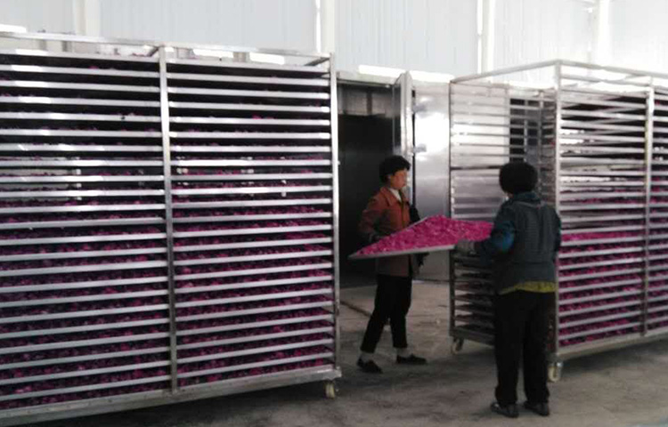 該項目以6P烘干除濕一體主機帶25立方烘干房作為標準型號,一批次可以放入鮮花蕊1800斤左右。整個烘干房可以裝入8臺物料車,每臺物料車分12—14層,層間距約為8—12厘米。物料車須使用304不銹鋼篩網,避免對物料造成生產污染。