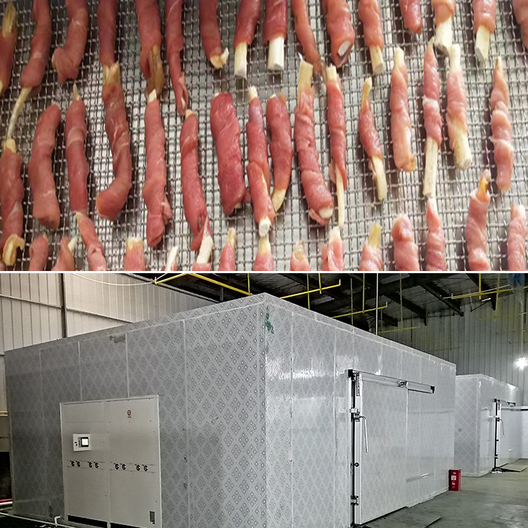 寵物食品烘干機的出現則一舉解決了上述烘干方式的弊端。作為一種接近自然晾干的溫和干燥方式,在干燥過程中食品表面水分蒸發速度與內部水分向表面遷移速度比較接近,使干燥后的貓糧狗糧品質好、色澤鮮、產品等級高;干燥過程中,循環空氣的溫度、濕度及循環流量可得到精確有效的控制,且溫度調節范圍為常溫到75℃,相對濕度調節范圍為5%~85%;可同時進行多品種、多種類的干燥,其密閉的烘干環境可以防止蚊蟲以及外部污染物接觸到烘干中的貓糧狗糧,確保安全衛生。