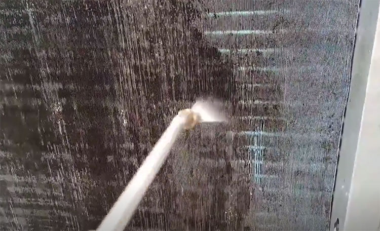 接下來(lái),對(duì)于熱泵蒸發(fā)器翅片上較重的塵垢污物,可使用細(xì)軟毛刷或者用電動(dòng)吸塵器清除一遍,吸塵器可有效清除翅片上粘染并難以清洗絮狀物、灰塵等,然后再用高壓水槍進(jìn)一步?jīng)_洗翅片表面灰塵。之后再用噴頭式清潔劑,順著翅片的方向從上往下清洗,從左到右來(lái)回均勻噴射至蒸發(fā)器的翅片上,保證清潔泡沫完全將蒸發(fā)器表面覆蓋。
